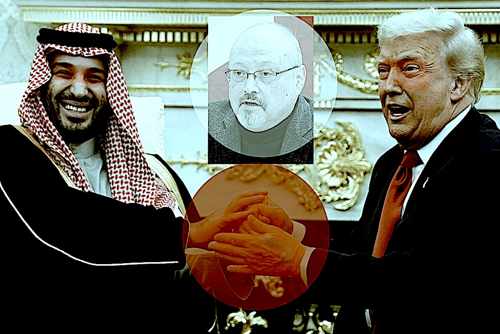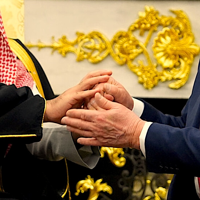 President Donald Trump and Saudi Arabia’s Crown Prince Mohammed bin Salman fondle each other’s bloody hands as corrupt blood bothers hand in hand!