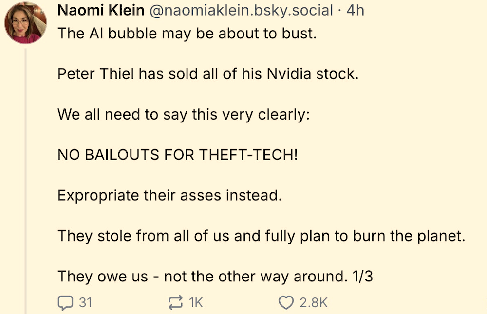“Welcome to the Great AI Bubble, a metastasized trillion dollar tech tumour so massive it’s practically visible from space.”