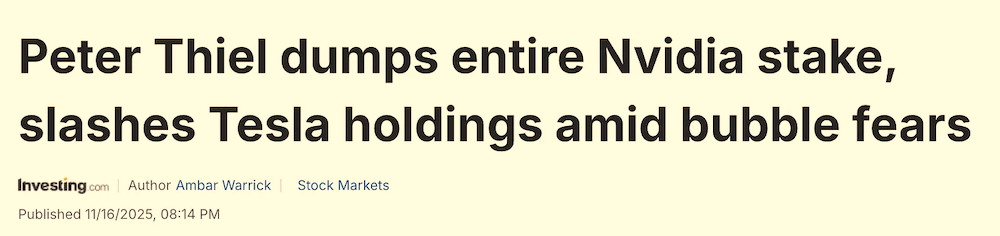 And today, in a strange bit of timing, news lands that Peter Thiel – the closest thing the modern world has to a real-life Bond villain – has dumped his entire holding in Nvidia, the chip manufacturer. That’s the company which, alongside OpenAI, sits at the very centre of a trillion dollar…gamble. Or, as some people are calling it, a bubble. A bubble that could upend the entire US economy.