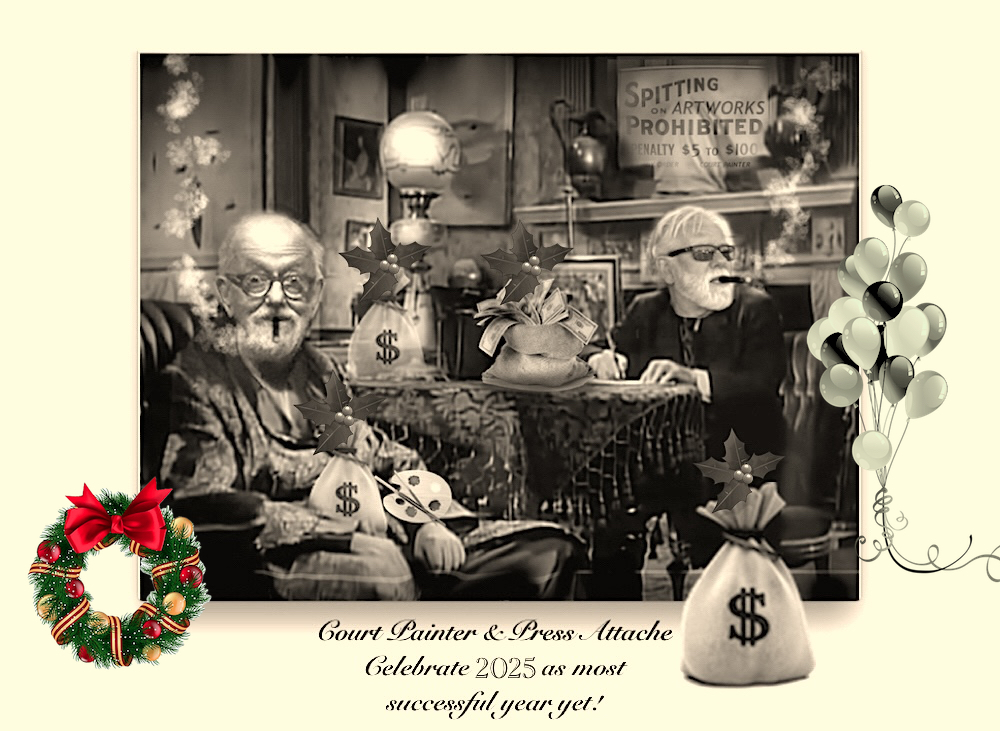 However, Court Painter was distracted by a major commission for The Sourpuss Sceptic Society, which includes two paintings featuring a beautiful white elephant. The society is expected to eventually gift these works individually to the Government of Alberta and the Government of Canada for a substantial tax write-off.