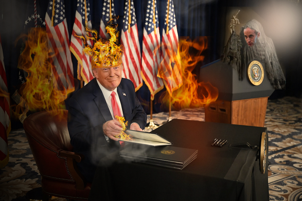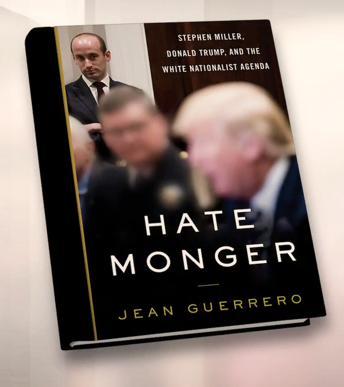 Stephen Miller without makeup.Recent book by Jean Guerrero on Stephen Miller entitled HATE MONGER.Court Painter reading Hate Monger between brush strokes.The Donald showing off his pyrotechnic skills with Stephen Miller in supporting role.