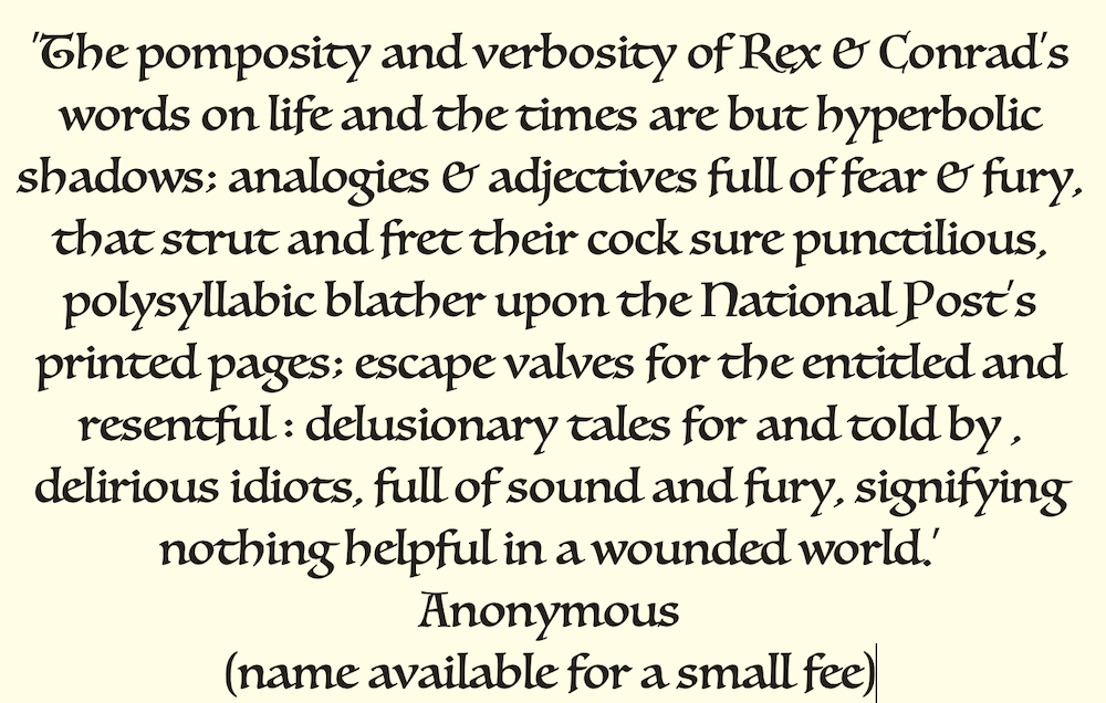 If you haven’t read the latest screeds in the National Post by Rex Evil Eye Murphy and Lord Black of Swillharbour, don’t bother!