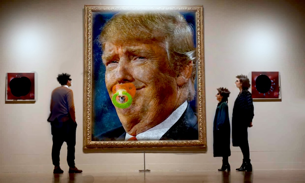 The portrait’s background ,as one would expect in a black & white painting, is a subtle fusion of swirling greys, evoking an impression of unyielding authority and rock hard masculine prowess. The Court Painter employed a combination of traditional and contemporary artistic techniques to craft a compelling and visually arresting portrayal of The Donald’s imposing scowl supported but not visible in the painting by his substantial 215-pound presence.