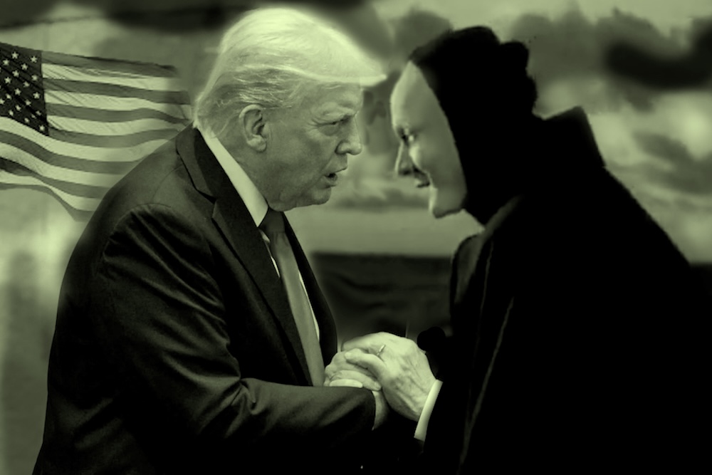 The Ultimate Dealmaker/ Collector and Court Painter flank a recent diptych “Let’s make a Deal’