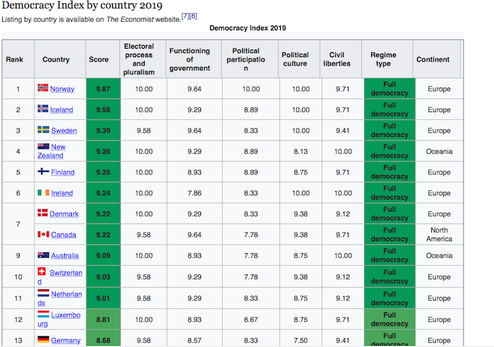 Editors note: Court Painter has no idea whether the Democracy Index is accurate however make of it what you will!