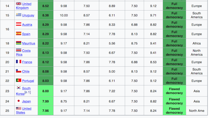 Coming in at #25 The United States of America under Regime Type is listed as Flawed Democracy.