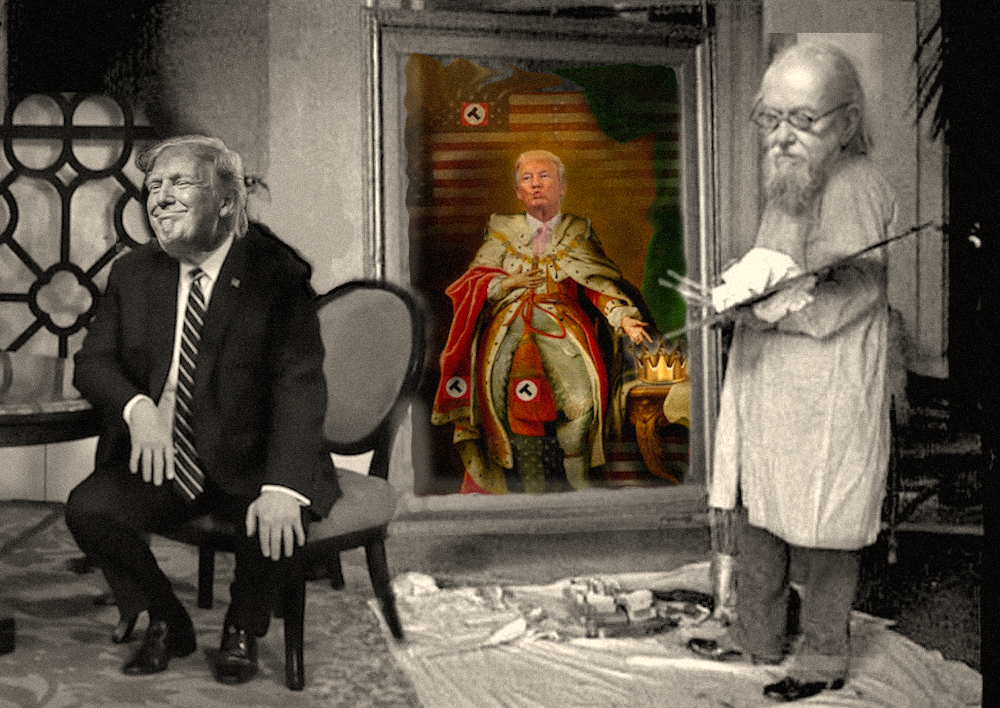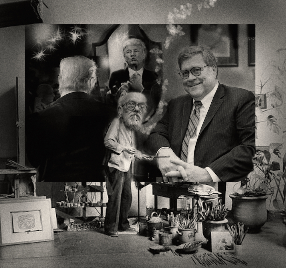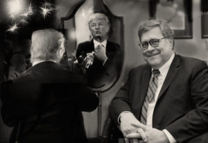 The Donald checks his tie while William Barr stands admiringly off to the side.