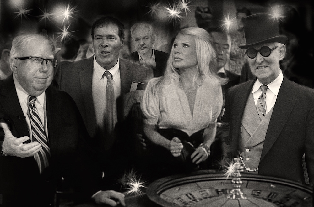 Glimpses of The Dedicated Man of Fashion and dirty trickster Roger Stone: captured in various settings and remaining sharp as a tack as he hangs with pals including the Trumps, Corsi, Credico, Assange, the Manhattan Madam and others.