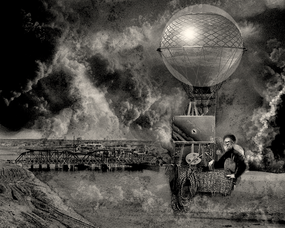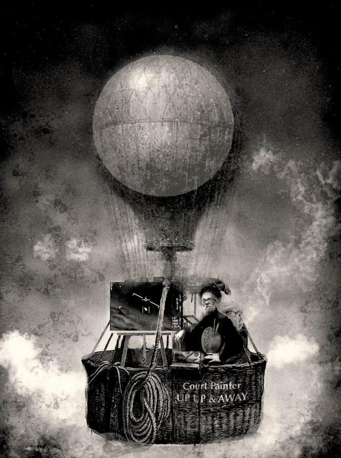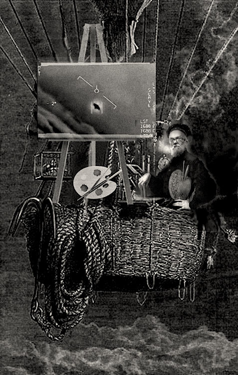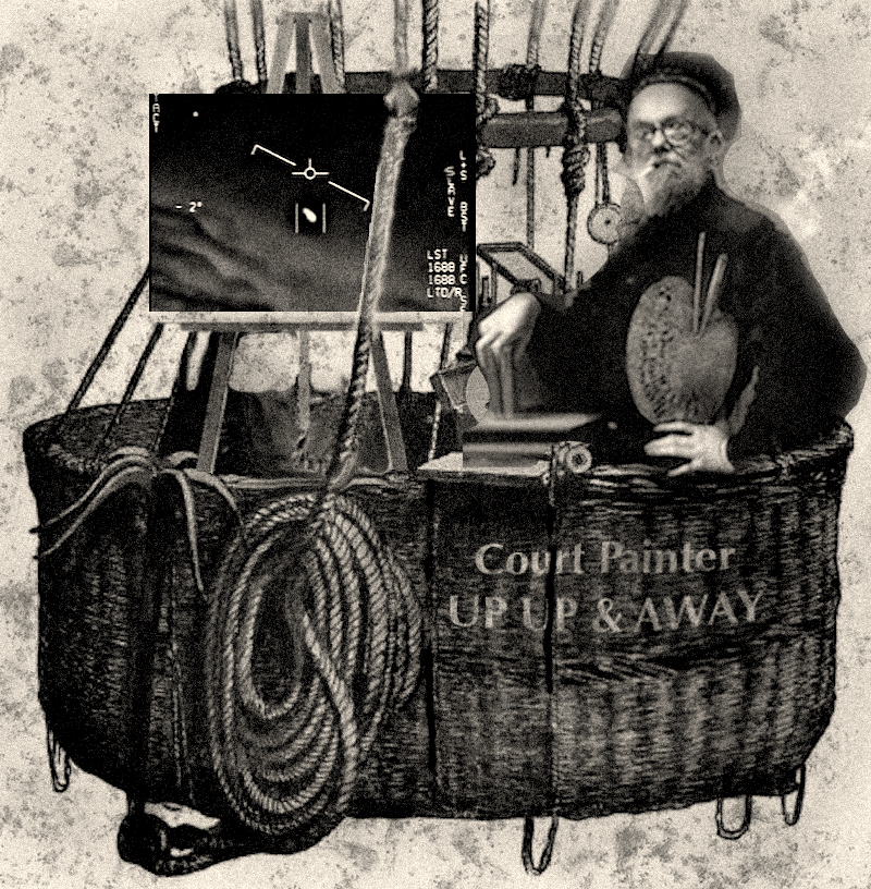 National Guard helicopters and NORAD jets pursued the balloon but hesitated to shoot it down because of it’s valuable cultural icon cargo. Court Painter could be seen by NORAD jet pilots waving with one hand from the basket while painting with the other.It was reported that an object had been seen falling from the balloon, and after a search was begun ,a stunning painting depicting a UFO was found beside some tumbleweeds on the banks of the Elbow River.