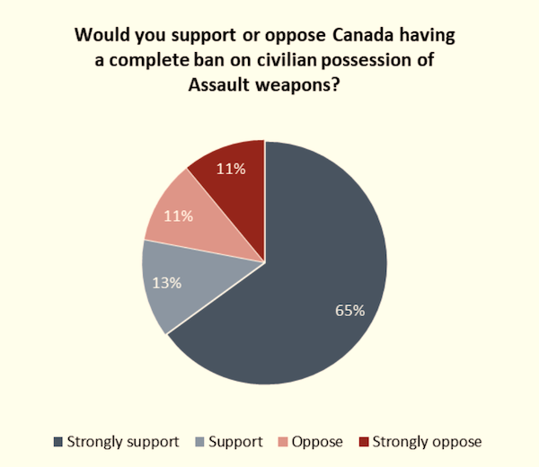 The results of the latest public opinion survey from the non-profit Angus Reid Institute show an overwhelming majority – nearly four-in-five – support a complete prohibition on civilian possession of the types of weapons used in the Montreal Massacre in 1989, and most recently, the rampage of an assault weapon-carrying murderer who killed 22 people in Nova Scotia last month.